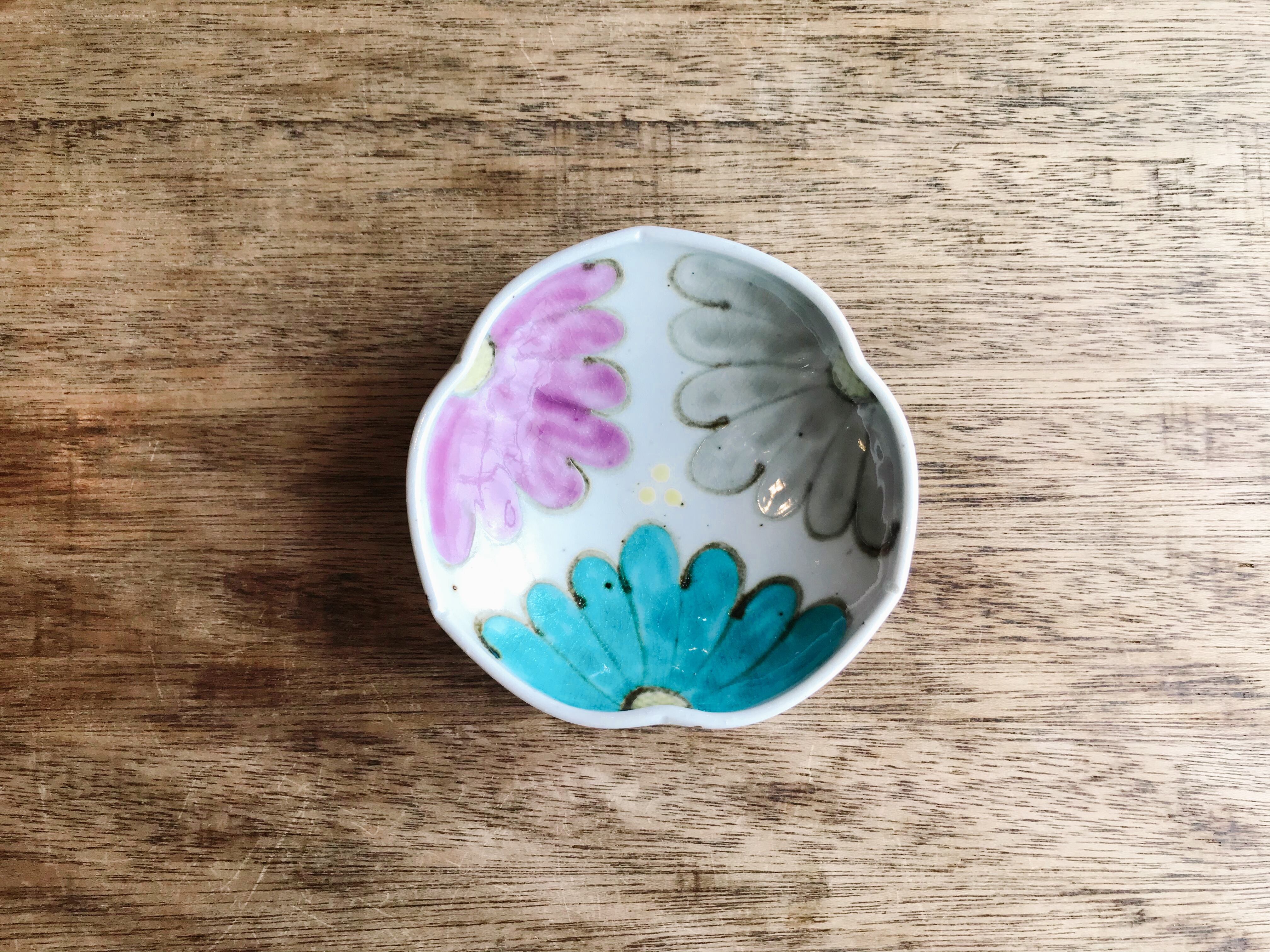 砥部焼/皐月窯/4寸玉縁輪花皿(菊三種)