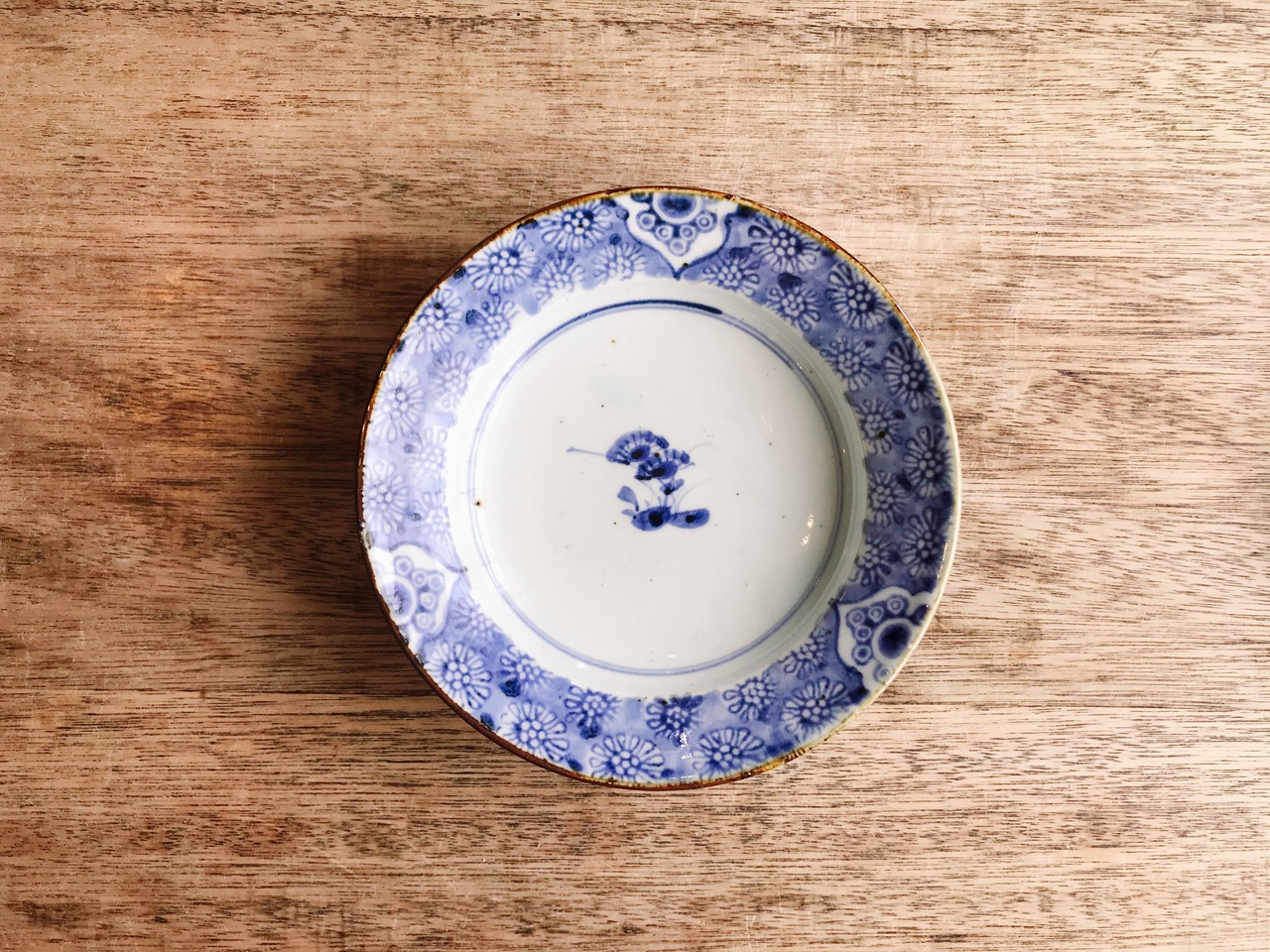 砥部焼/中田窯/6寸リム皿(印判菊/呉須)ブルー①
