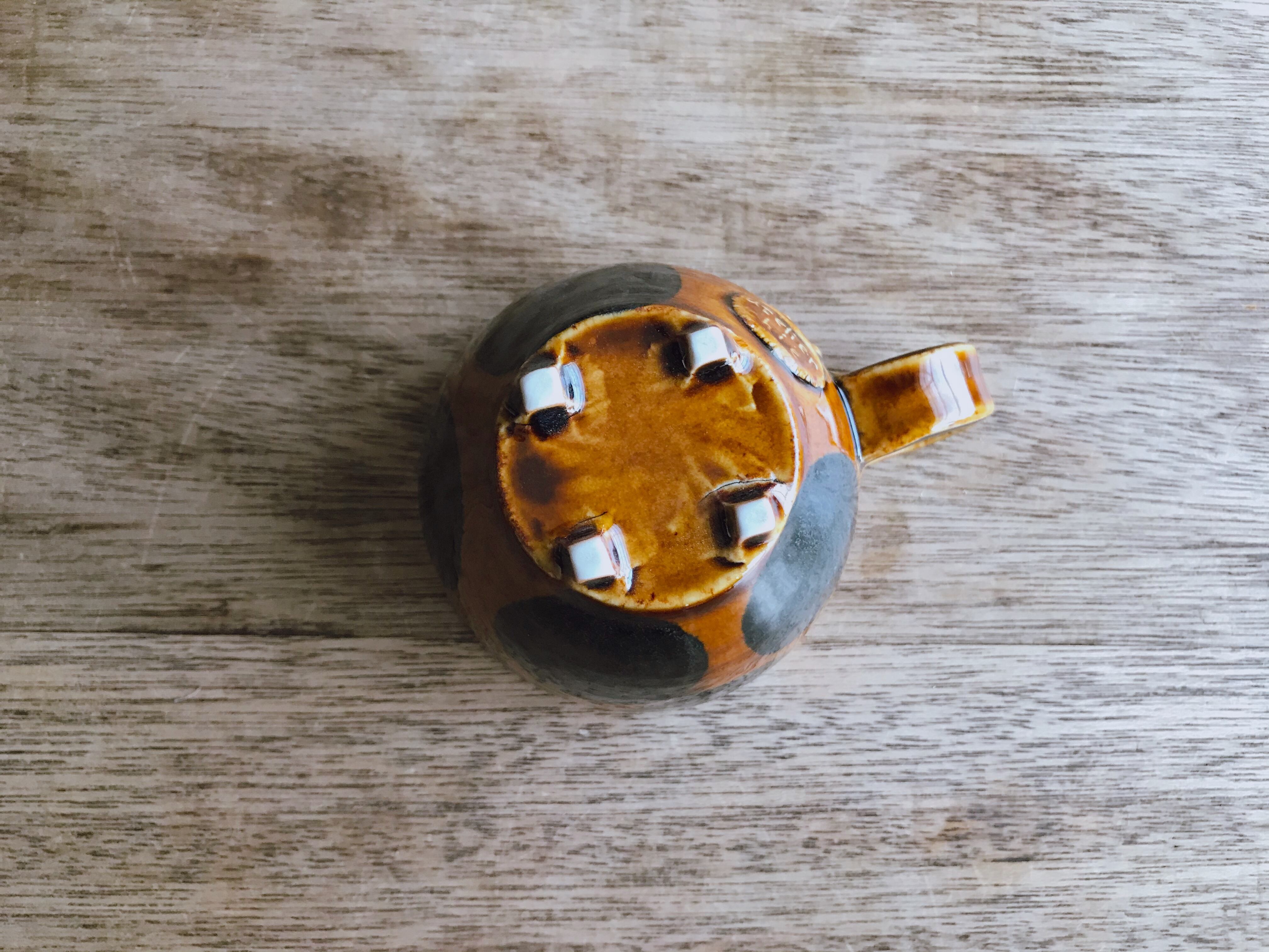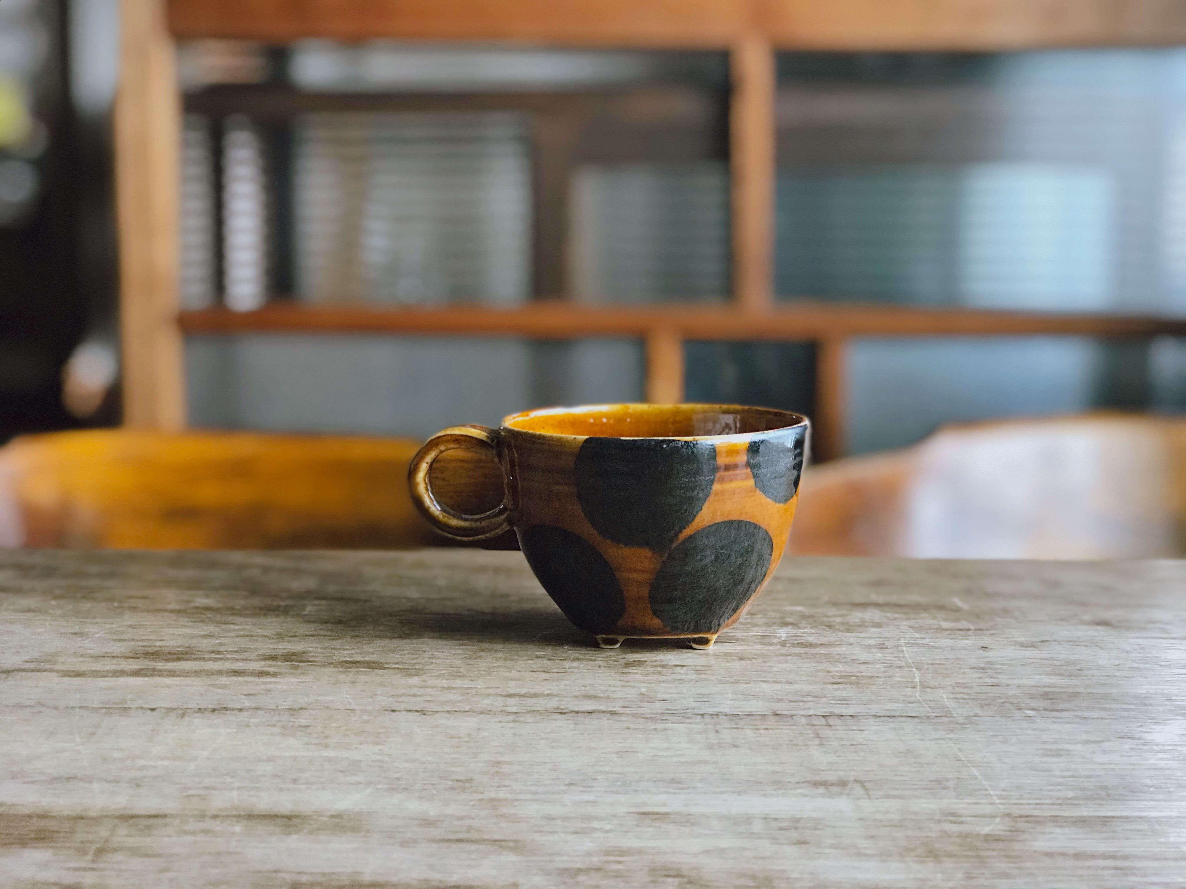 砥部焼/atelier chie/四つ足手付きカップ(黒ドット×飴釉)②