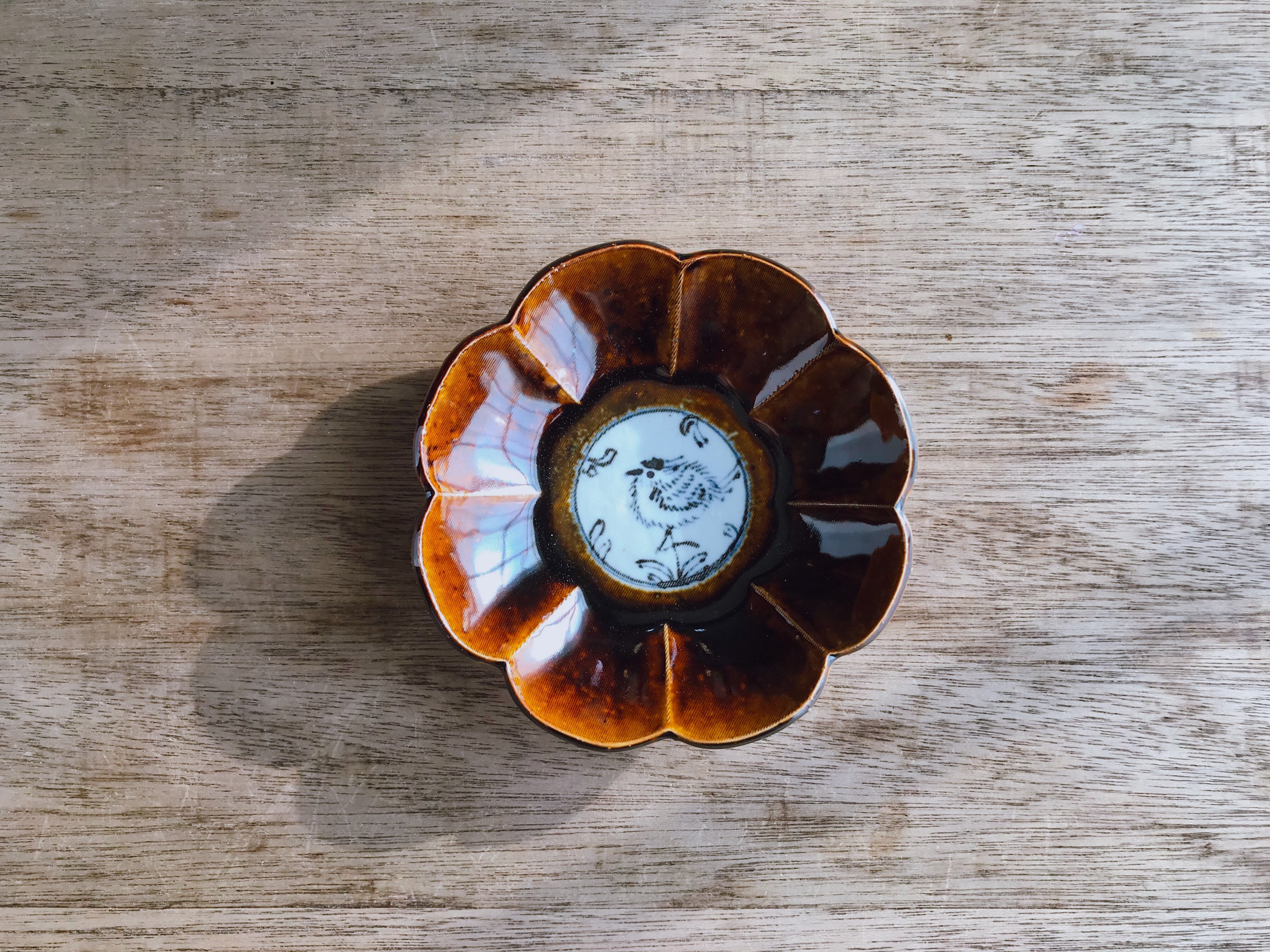 砥部焼/中田窯/4.5寸型打輪花皿(飴釉/白抜呉須鳥)