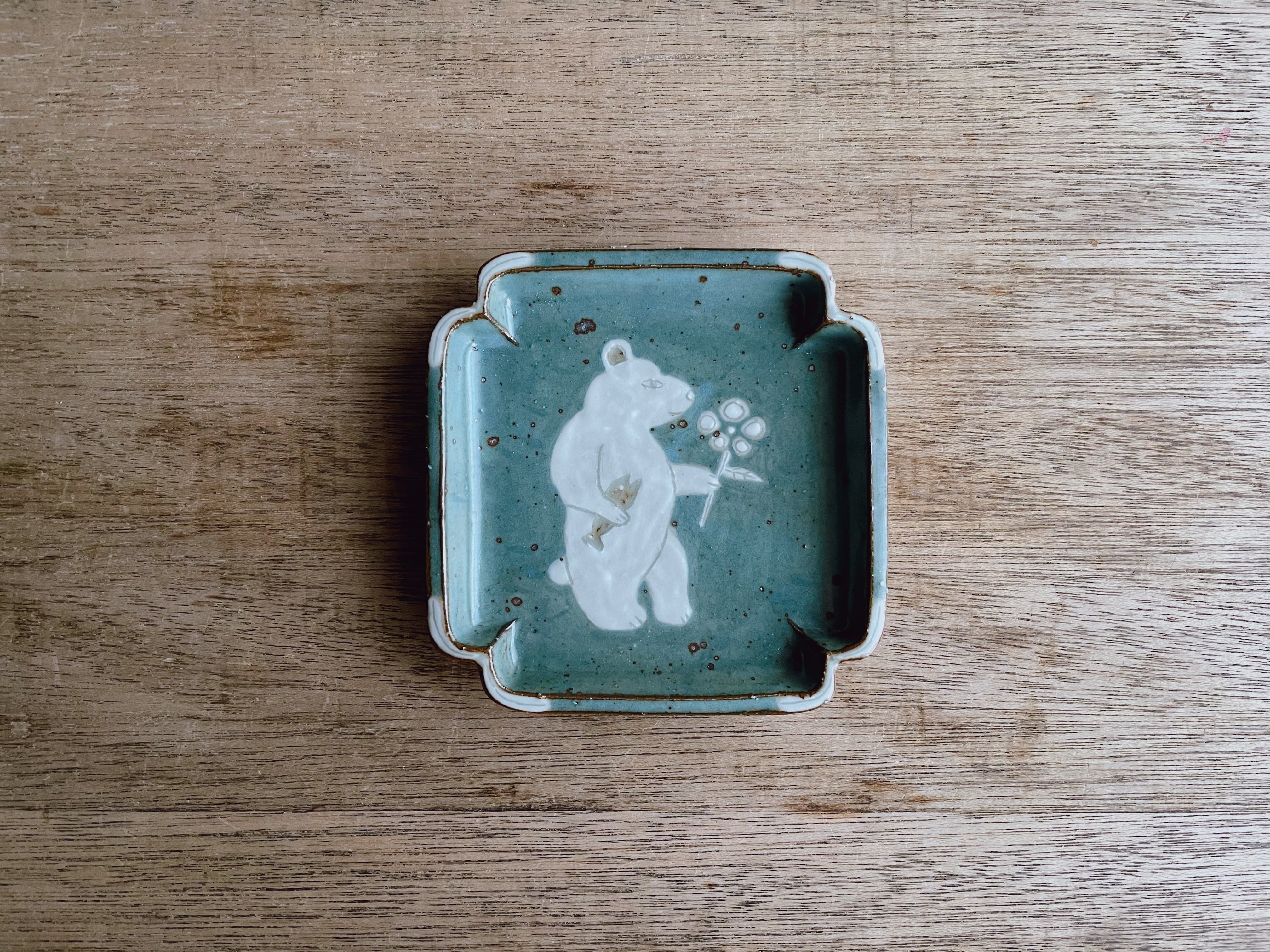 砥部焼/皐月窯/4寸たたら四角隅切皿(青熊)①