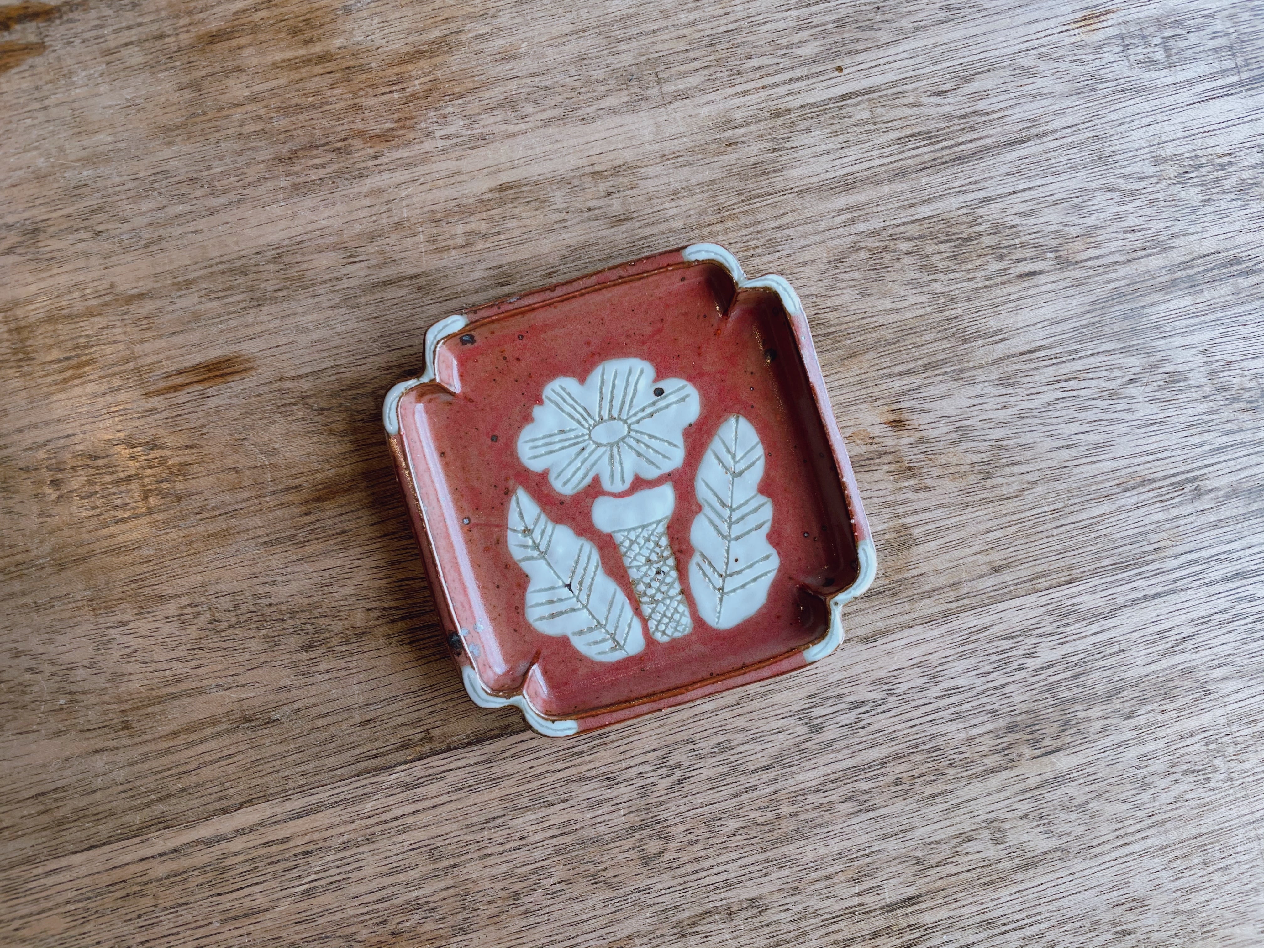 砥部焼/皐月窯/4寸たたら四角隅切皿(赤花)②