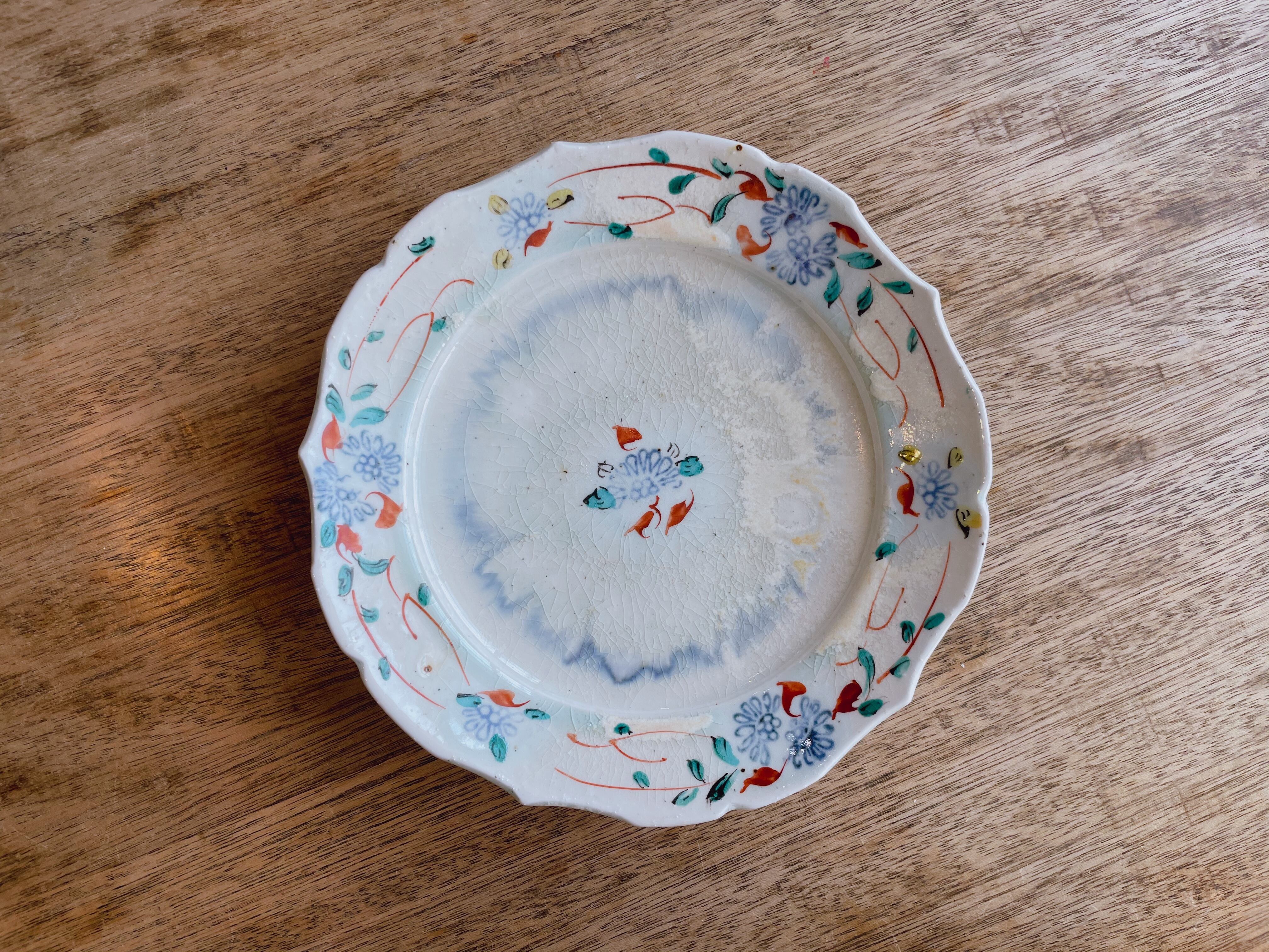 砥部焼/中田窯/8寸リム皿輪花(灰釉/上絵)