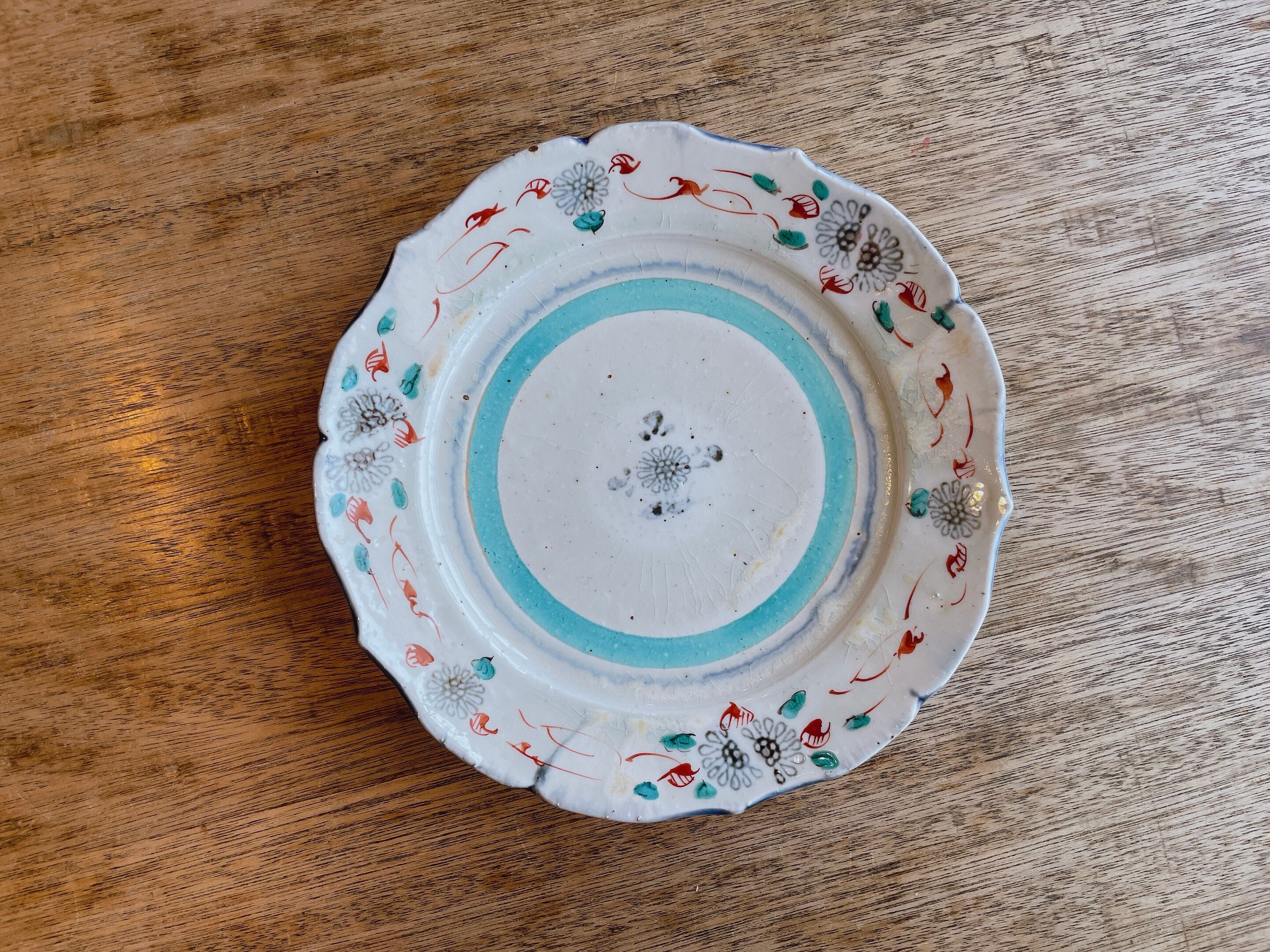 砥部焼/中田窯/8寸リム皿(灰釉上絵/輪花)緑