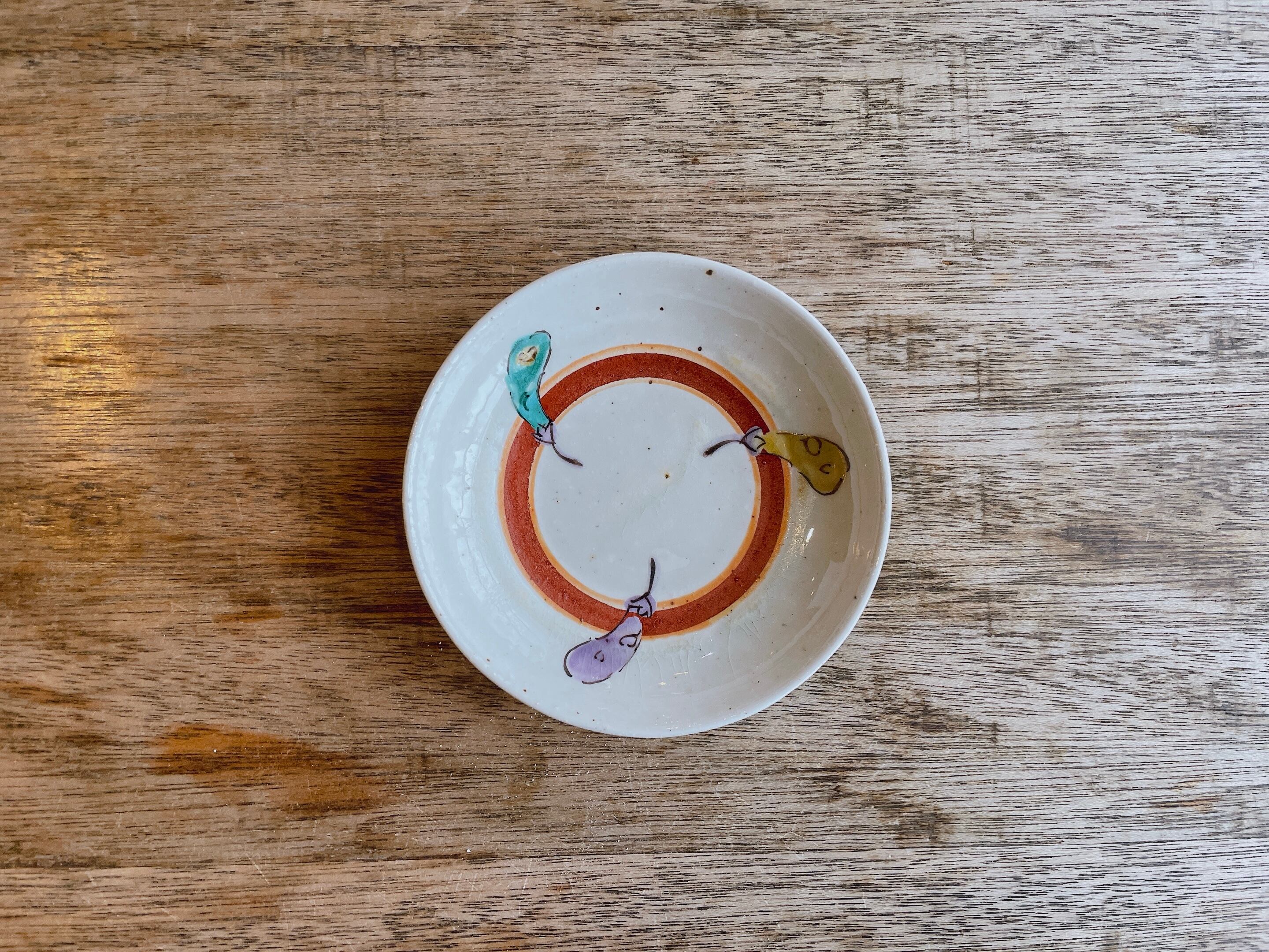 砥部焼/中田窯/4寸丸皿(灰釉加彩/茄子)①