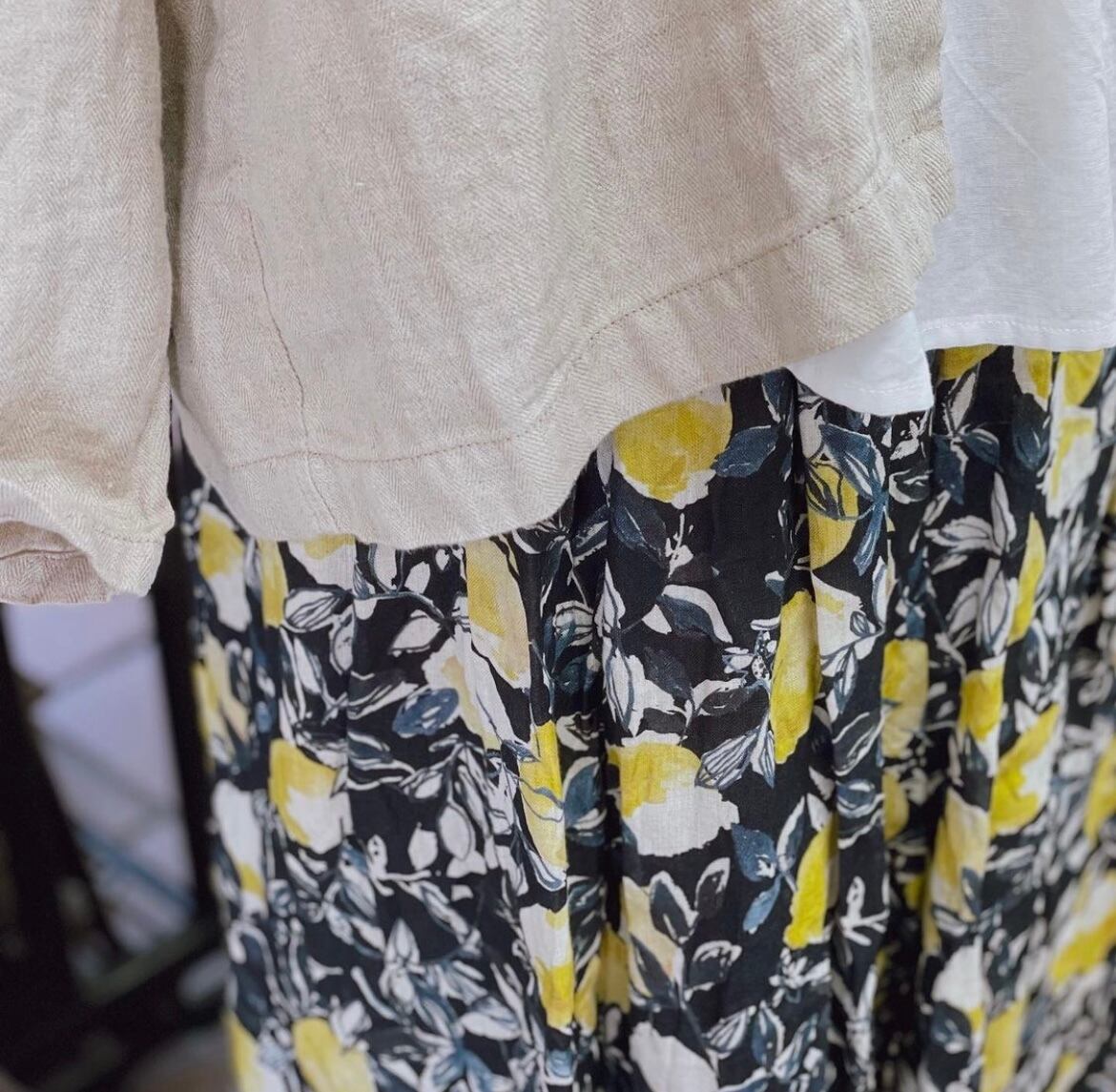 ウエストはゴムギャザー、コットンローンの裏地、両サイドポケット付です。