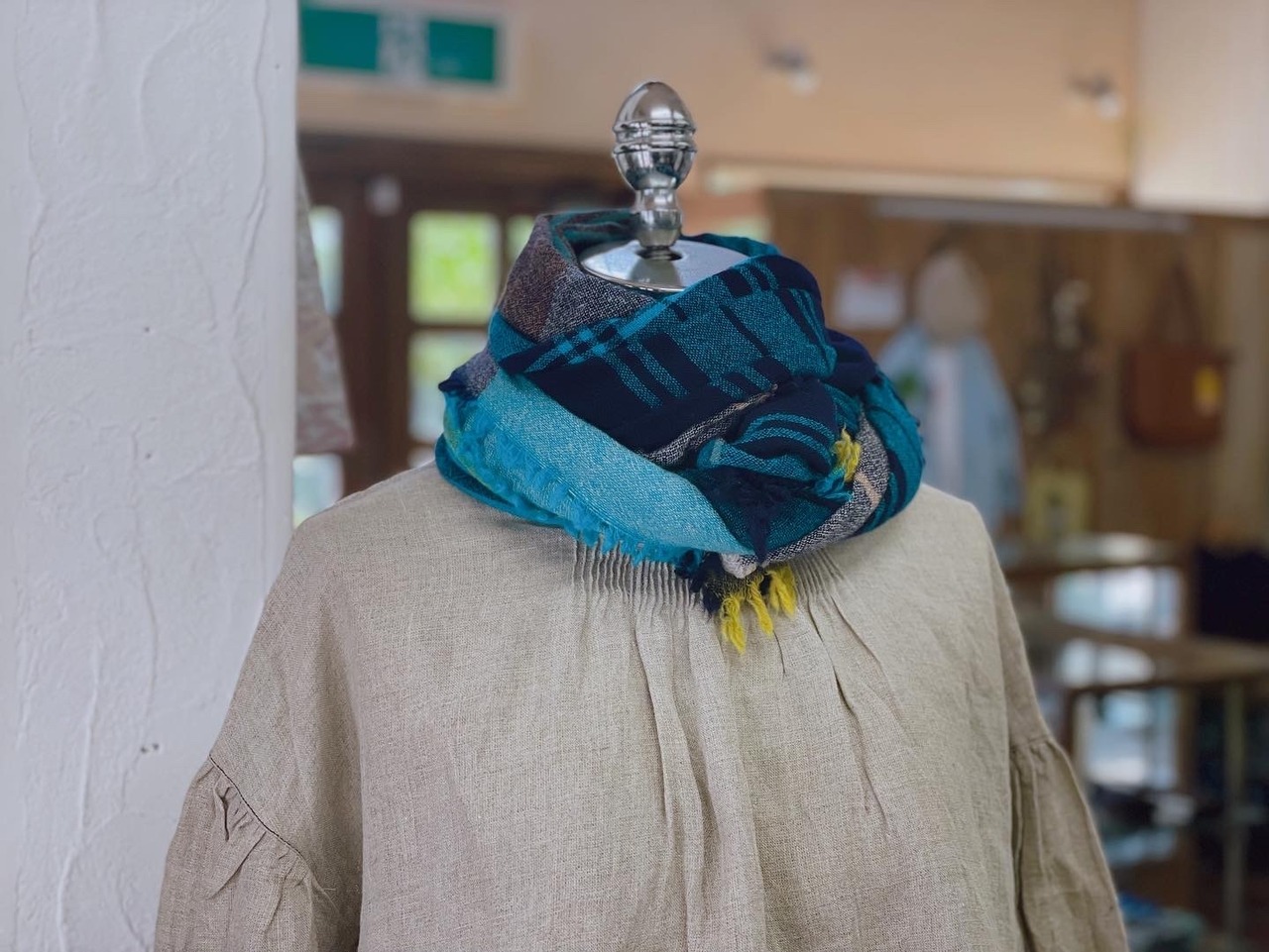 巻くと表情が柔らかい四方フリンジ。