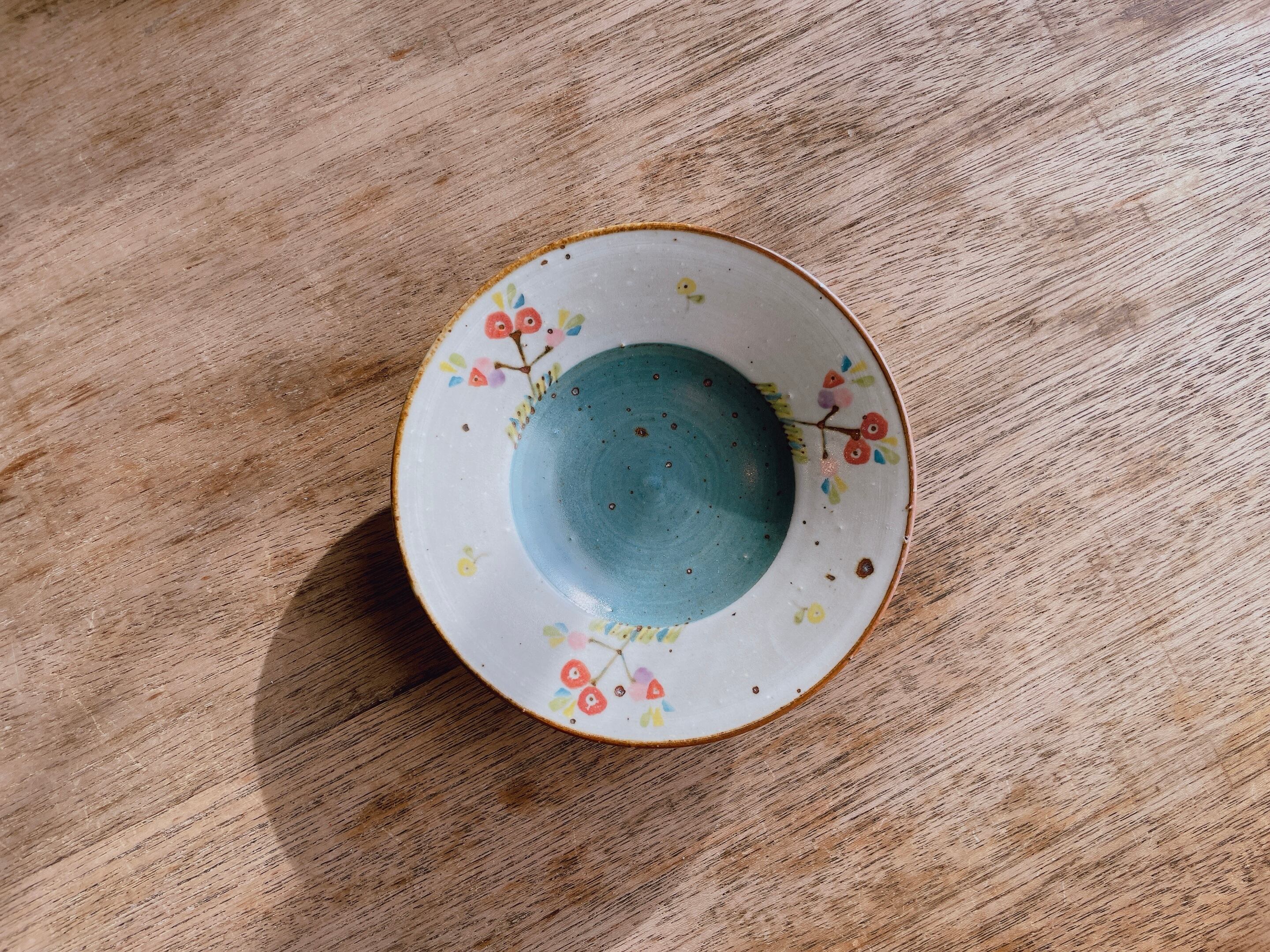 砥部焼/皐月窯/赤砥/4.5寸縁付皿(花/緑)