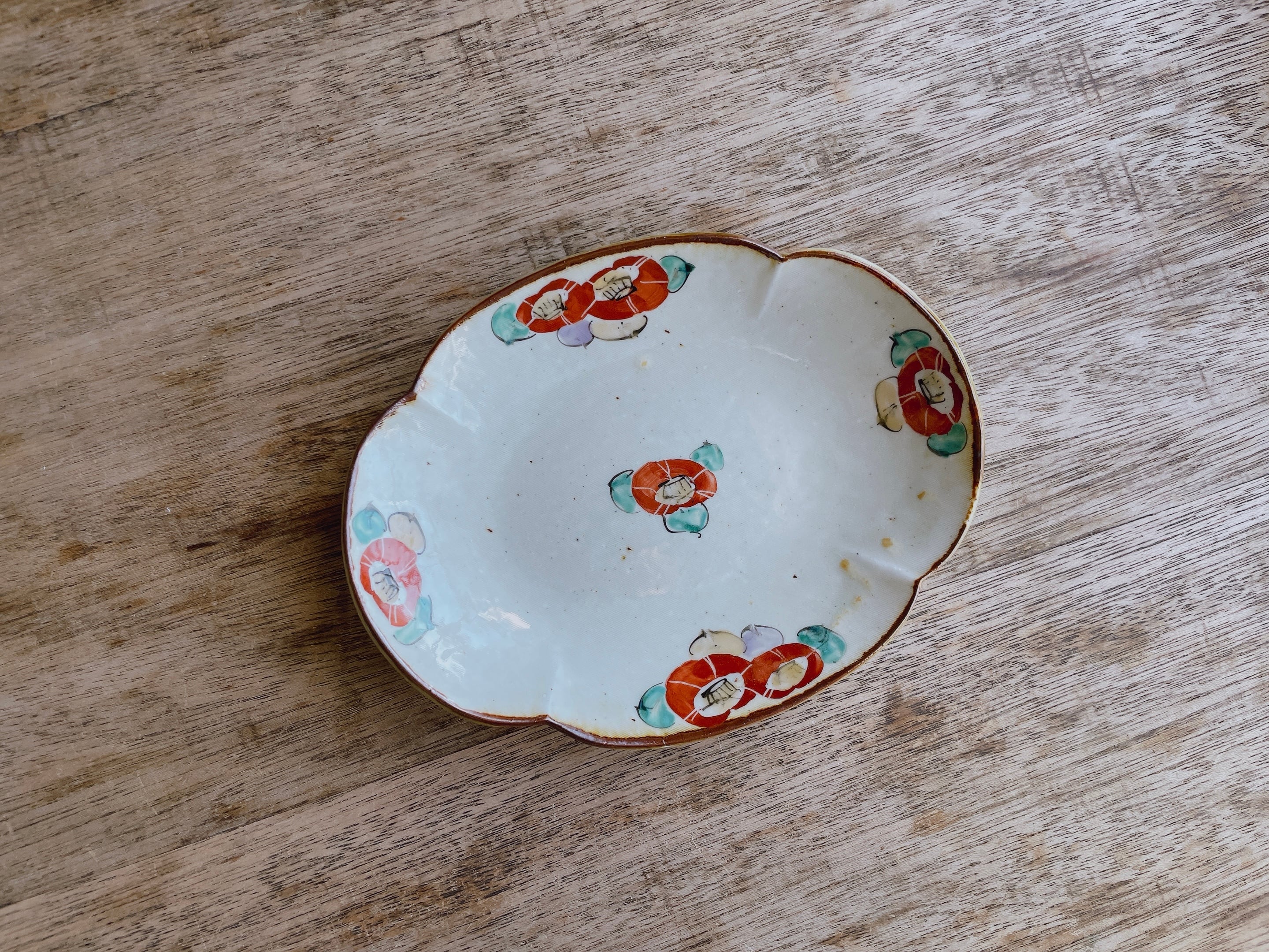 砥部焼/中田窯/6.5寸木瓜型皿(灰釉加彩/椿)①
