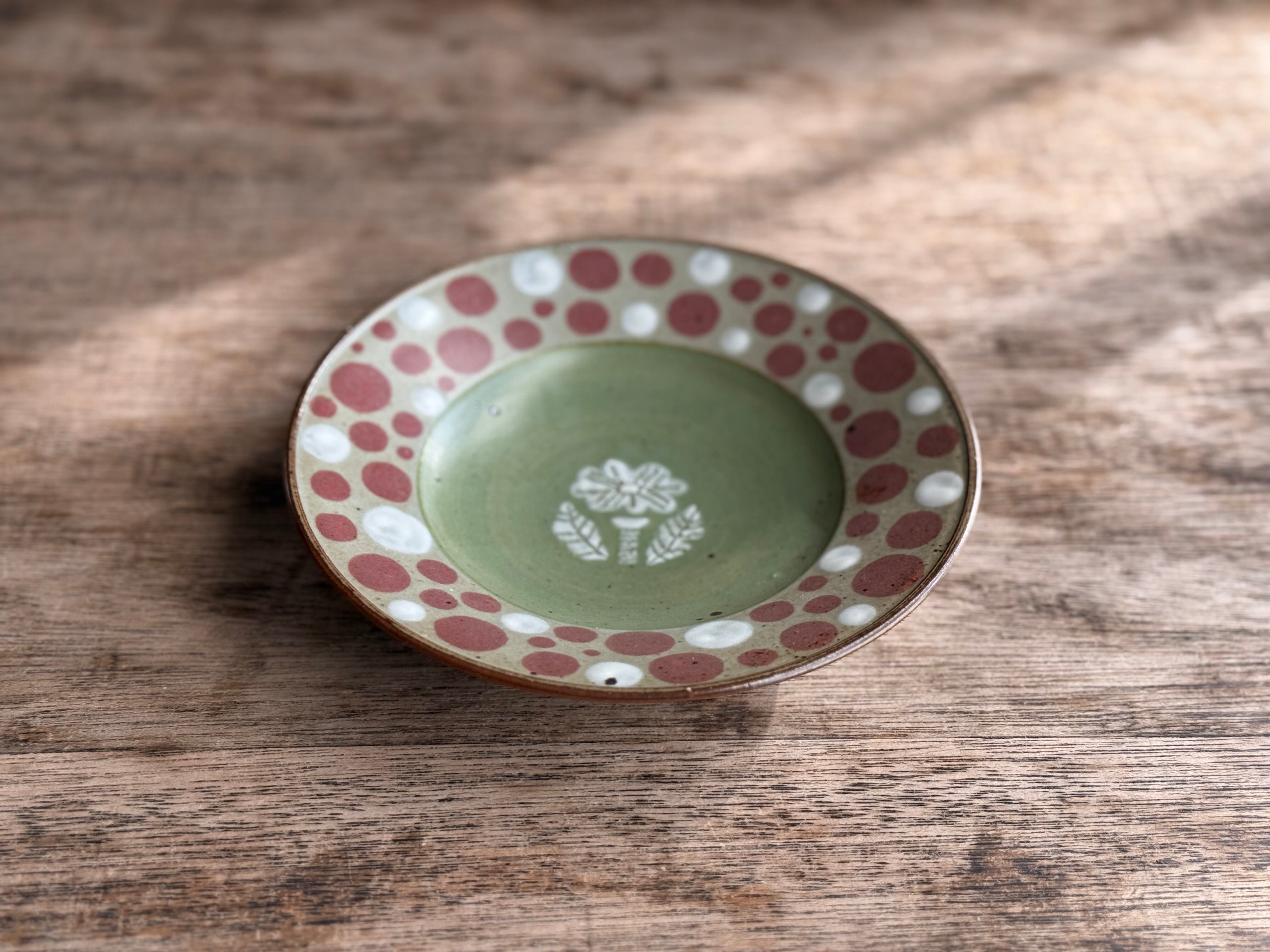 砥部焼/皐月窯/5.5寸縁付皿(赤緑・水玉花)